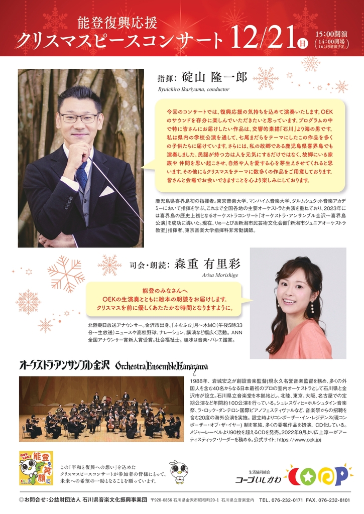 | 公演日 | 2025年12月21日(日)15:00開演(開場14:00) 16:45終演予定 | 会場 | 能登演劇堂 石川県七尾市中島町中島上部9番地 | 主催 | 生活協同組合コープいしかわ |