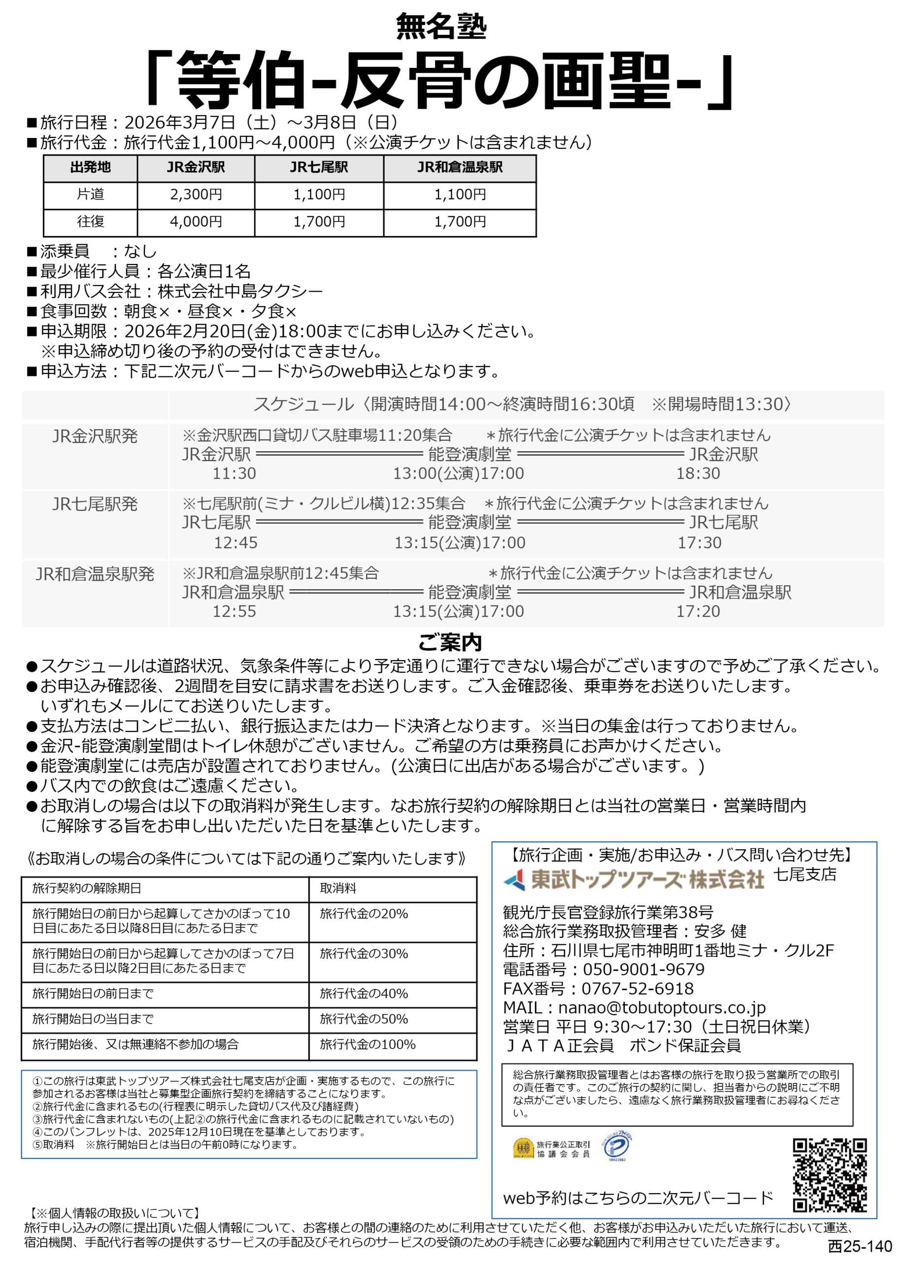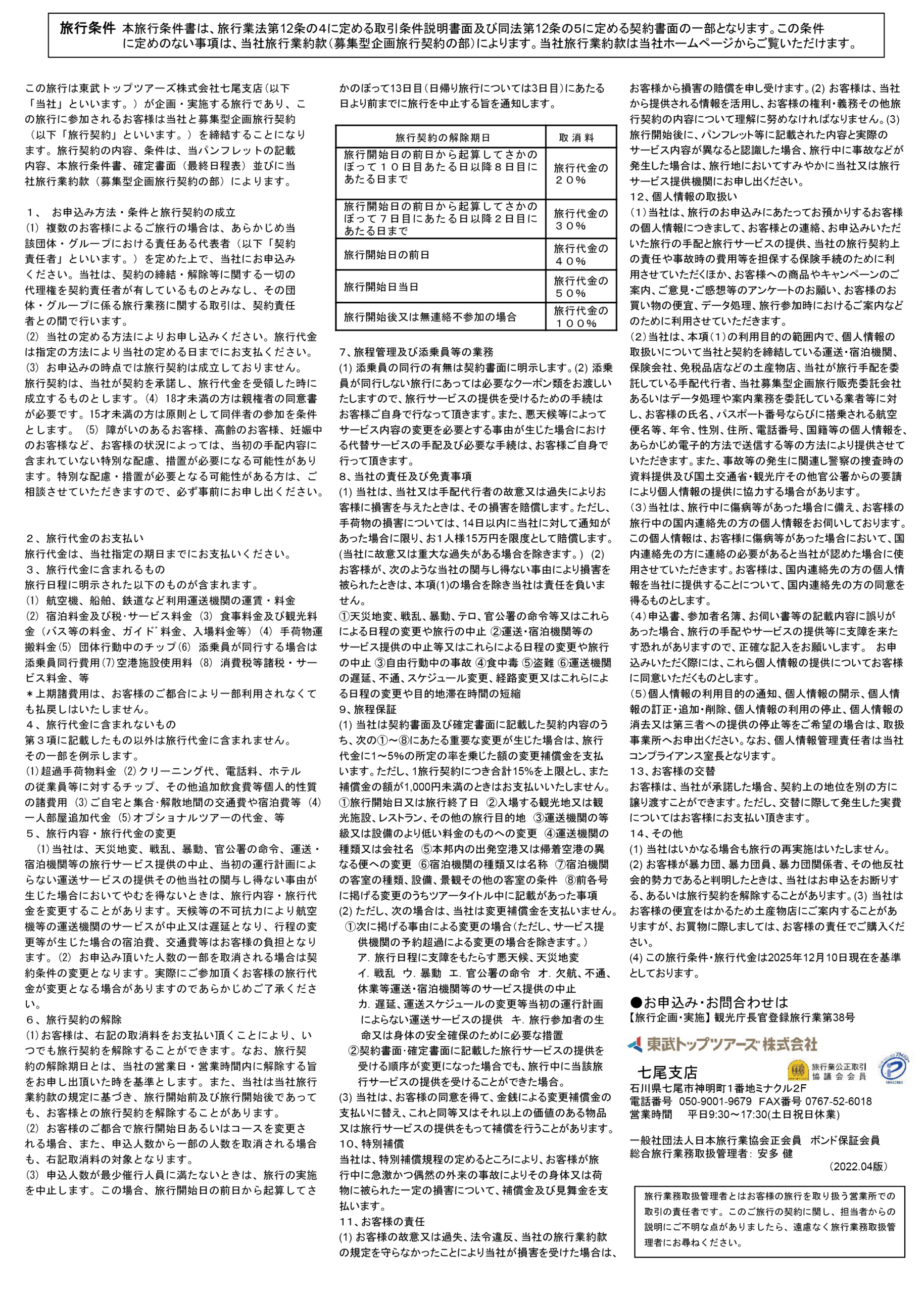 東武トップツアーズ(株) 七尾支店 TEL:050-9001-9679(土日祝休み)